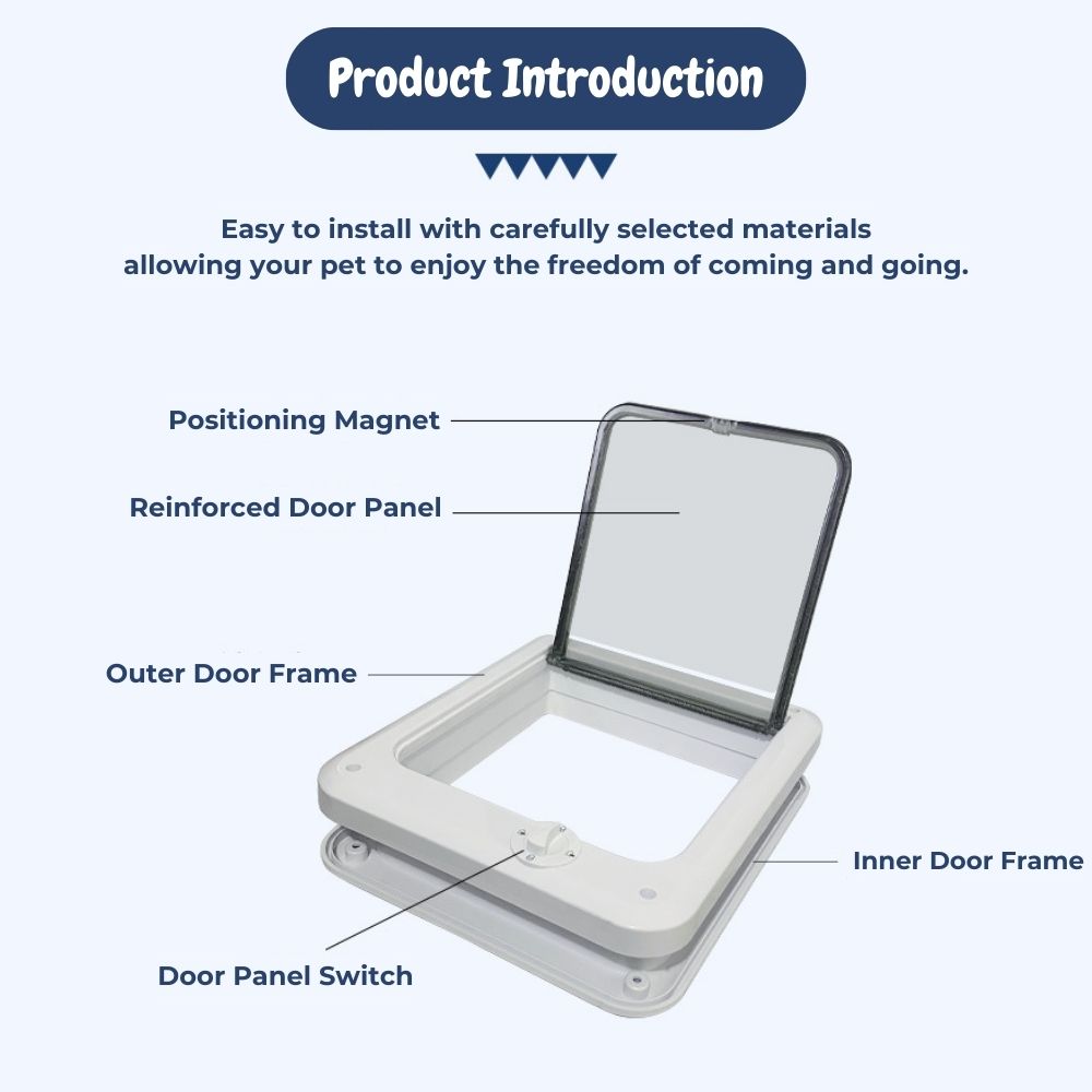 This pet door is crafted with high-quality materials to ensure durability, safety, and ease of use for both you and your pet. Designed with a reinforced door panel, magnetic closure, and reliable panel switch, it provides a secure gateway for your pet's freedom.