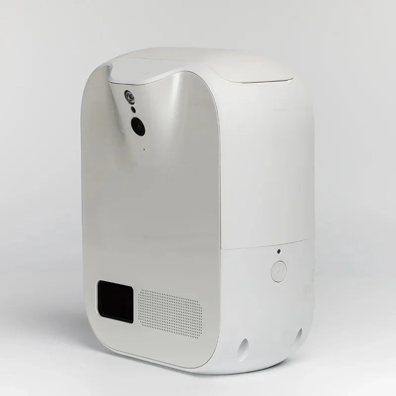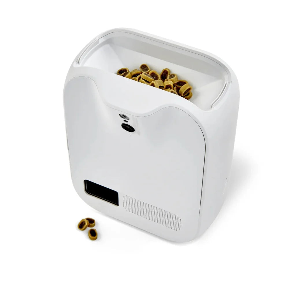 The remote treat dispenser allows you to toss treats to your pet via the app. It is compatible with small, dry treats up to 1 cm in size, ensuring smooth dispensing without clogs.
